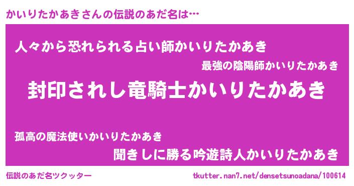 | 男性向けラノベタイトル風あだ名 | 『カイリタカアキアートオンライン』 |
