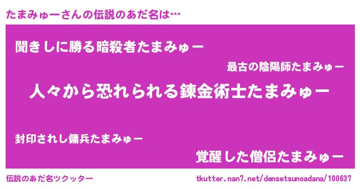 | 男性向けラノベタイトル風あだ名 | 『魔弾の王とたまみゅー』 |