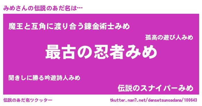 | ヒーロー風カッコイイあだ名 | 『仮面ミメダー』『ウルトラみめマン』 |