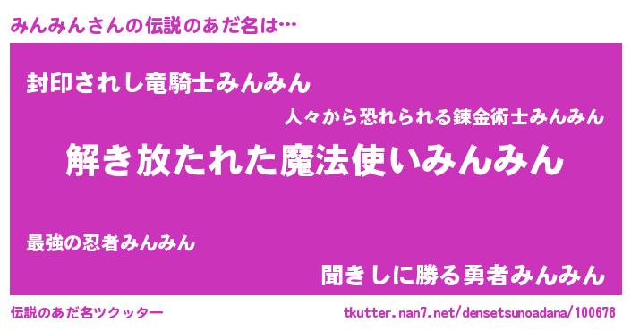 | ヒーロー風カッコイイあだ名 | 『仮面ミンダー』『天弓騎士ミン』 |