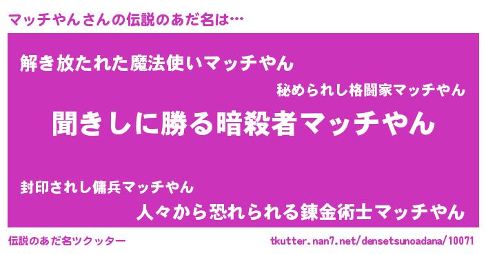 | 意味不明あだ名 | 『自称マッチやん』『永久保存マッチやん』 |