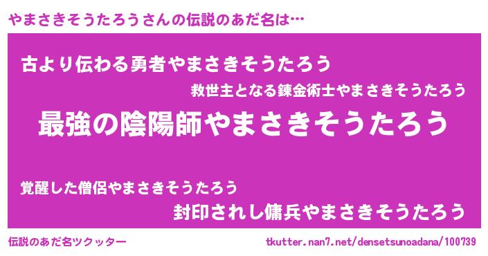 | 男性向けラノベタイトル風あだ名 | 『うちのやまさきそうたろうが世界を掌握している!』 |