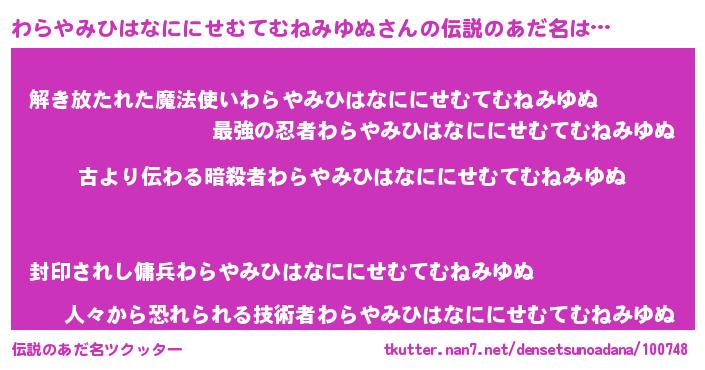 | 男性向けラノベタイトル風あだ名 | 『この素晴らしい世界にわらやみひはなににせむてむねみゆぬを!』 |