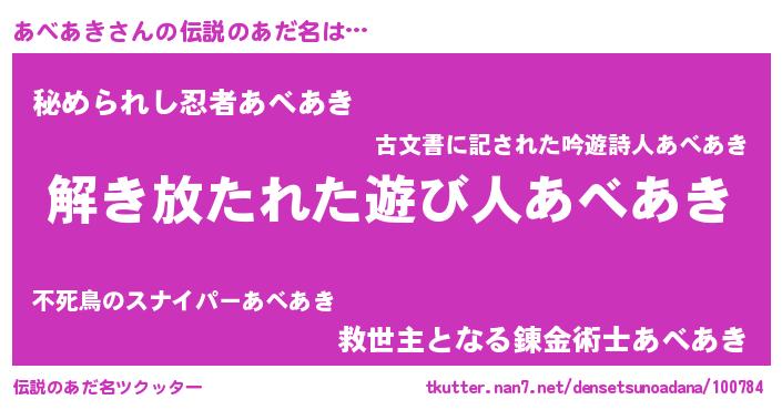 | 意味不明あだ名 | 『住所不定無職あべあき(91歳)』 |