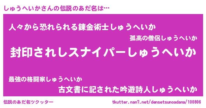 | 男性向けラノベタイトル風あだ名 | 『しゅうへいかに滅ぼされるだけの簡単なお仕事です』 |