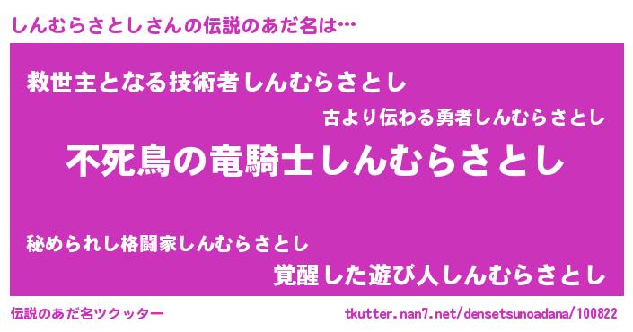 | 男性向けラノベタイトル風あだ名 | 『転生したらしんむらさとしだった件』 |