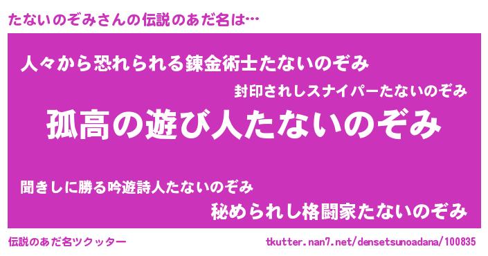 | 女子向けラノベタイトル風あだ名 | 『たないのぞみは平凡を望む』 |