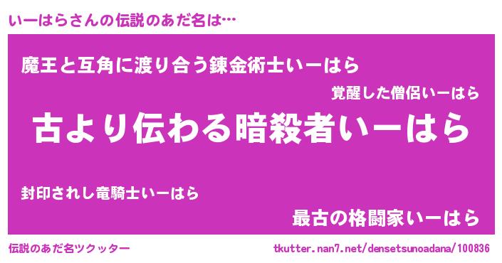 | 胡散臭い通販商品みたいなあだ名 | 『来世でも幸せになれる健康食品…その名も「いーはら」』 |