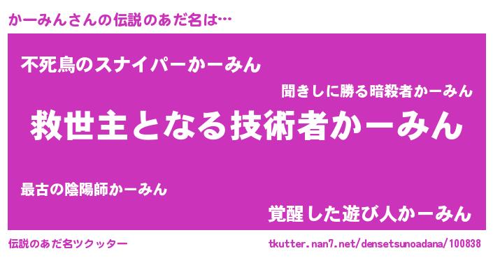 | ヒーロー風カッコイイあだ名 | 『慈愛の使者かーみん』『仮面カーダー』 |