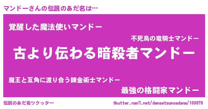 | 男性向けラノベタイトル風あだ名 | 『マンドーという概念が存在しない退屈な世界 』 |