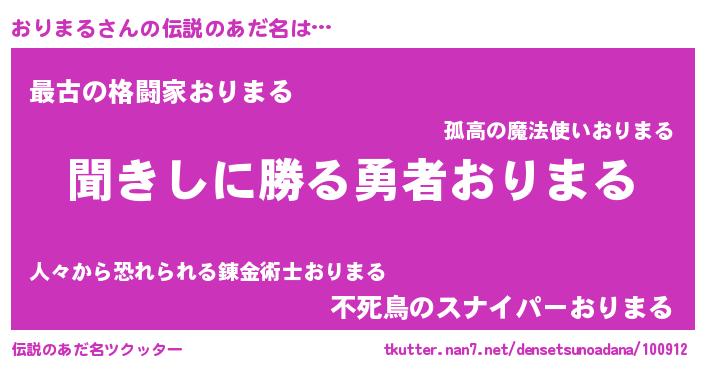 | 胡散臭い通販商品みたいなあだ名 | 『絶対に幸福をもたらす水素水…その名も「おりまる」』 |