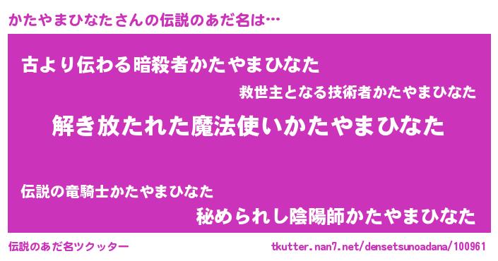 | ヒーロー風カッコイイあだ名 | 『魔戒騎士カタ』『ネオカタヤマヒナタ』 |