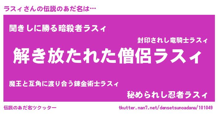 | ヒーロー風カッコイイあだ名 | 『ウルトラ戦士ラスィ』『仮面ラスダー』 |