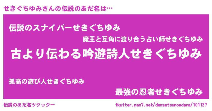 | ヒーロー風カッコイイあだ名 | 『仮面セキダー』『ネオセキグチユミ』 |