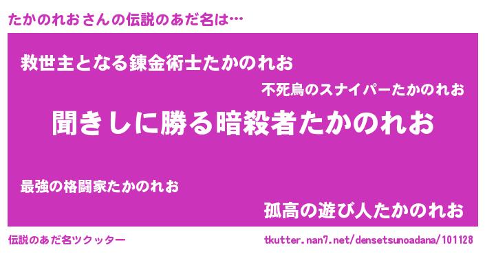 | 男性向けラノベタイトル風あだ名 | 『たかのれおという概念が存在しない退屈な世界 』 |