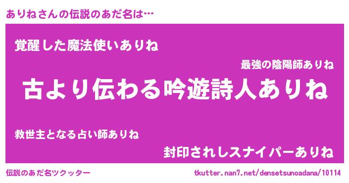 | 女子向けラノベタイトル風あだ名 | 『ありねの契約王妃』『ありね様がみてる』 |