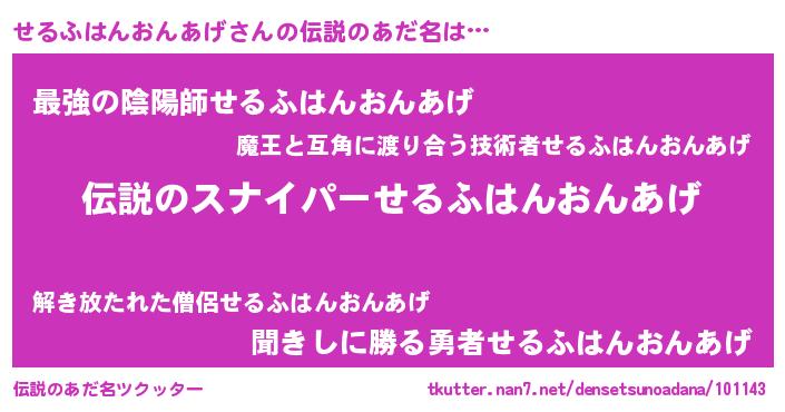 | 男性向けラノベタイトル風あだ名 | 『魔弾の王とせるふはんおんあげ』 |