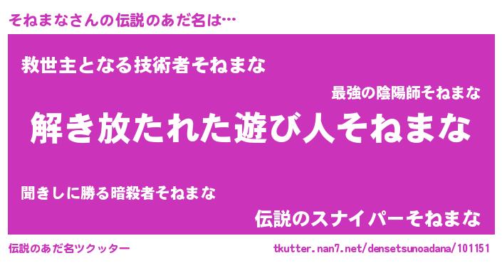 | ヒーロー風カッコイイあだ名 | 『銀牙騎士ソネ』『慈愛の使者そねまな』 |