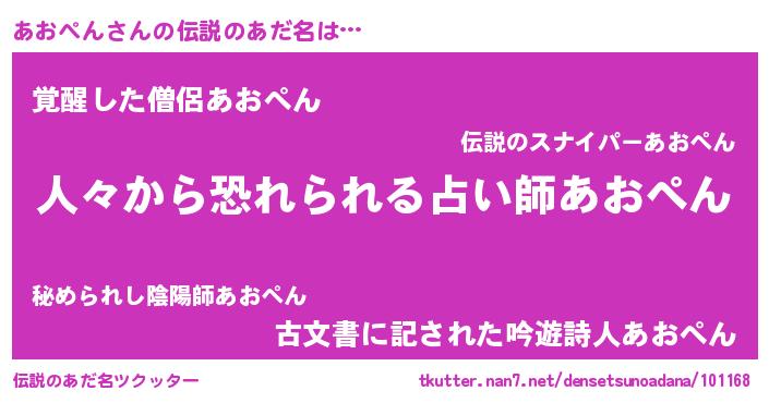 | 男性向けラノベタイトル風あだ名 | 『魔弾の王とあおぺん』 |