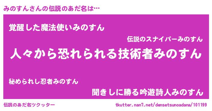 | 男性向けラノベタイトル風あだ名 | 『おまえをオタクにしてやるから、俺をみのすんにしてくれ! 』 |