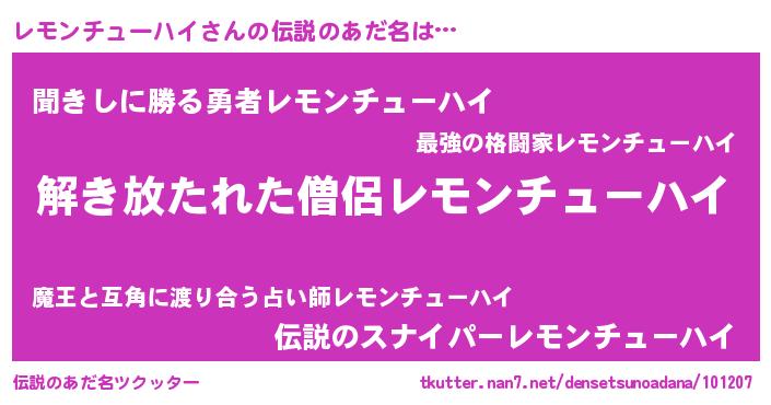 | 意味不明あだ名 | 『とにかく怪しいレモンチューハイ』 |