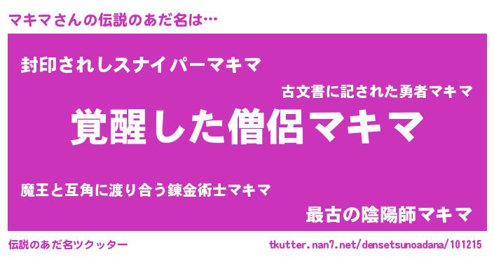 | 男性向けラノベタイトル風あだ名 | 『マキマ~年齢イコール彼女いない歴の魔法使い~』 |