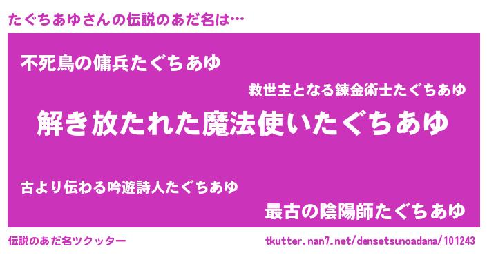 | 意味不明あだ名 | 『自称たぐちあゆ』『ペロリンたぐちあゆ』 |