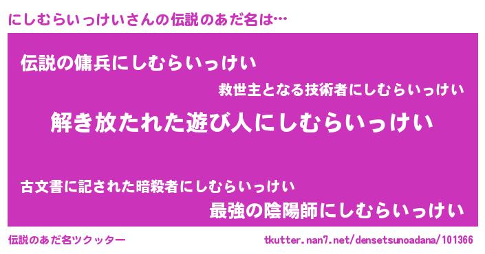 | 意味不明あだ名 | 『とにかく怪しいにしむらいっけい』 |