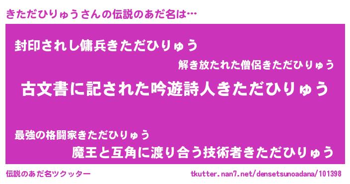 | 男性向けラノベタイトル風あだ名 | 『きただひりゅう~年齢イコール彼女いない歴の魔法使い~』 |