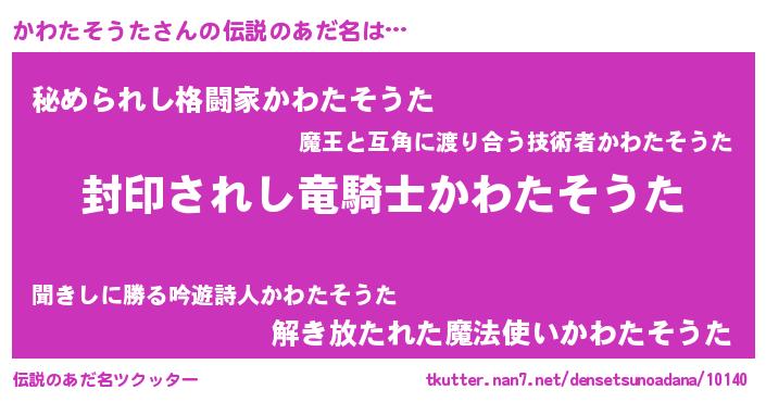| 男性向けラノベタイトル風あだ名 | 『カワタソウタアートオンライン』 |