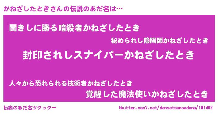 | ヒーロー風カッコイイあだ名 | 『スーパーカネザシタトキ』 |