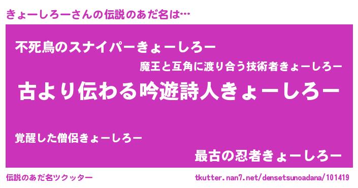 | 男性向けラノベタイトル風あだ名 | 『きょーしろーという概念が存在しない退屈な世界 』 |