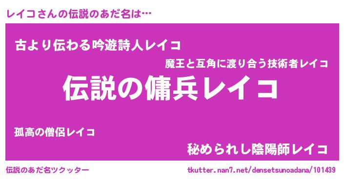 | 男性向けラノベタイトル風あだ名 | 『レイコスレイヤー』『魔弾の王とレイコ』 |