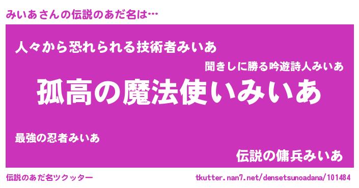 | 男性向けラノベタイトル風あだ名 | 『ミイアスレイヤー』『魔弾の王とみいあ』 |