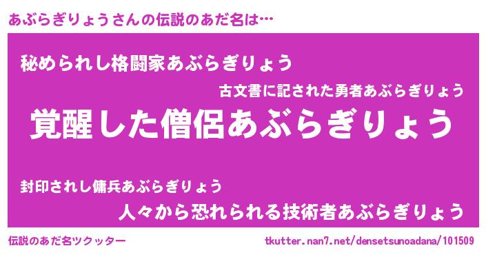 | 男性向けラノベタイトル風あだ名 | 『Re:あぶらぎりょうから始める異世界生活』 |