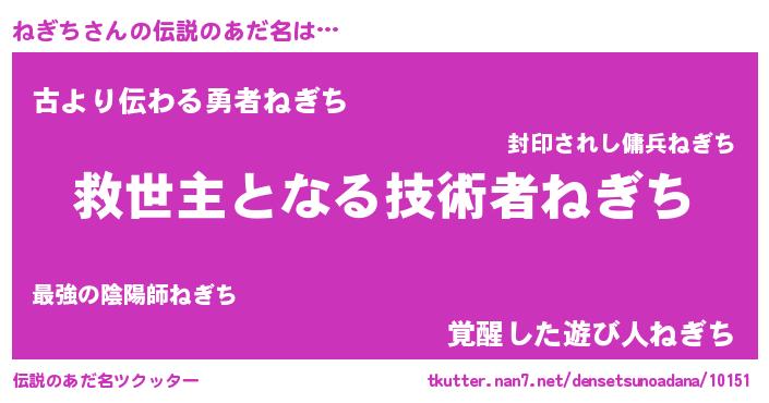 | 男性向けラノベタイトル風あだ名 | 『ねぎち~年齢イコール彼女いない歴の魔法使い~』 |