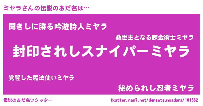 | 男性向けラノベタイトル風あだ名 | 『ミヤラに滅ぼされるだけの簡単なお仕事です』 |