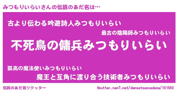 | 男性向けラノベタイトル風あだ名 | 『みつもりいらいの憂鬱』 |