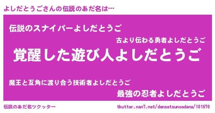 | ヒーロー風カッコイイあだ名 | 『天弓騎士ヨシ』『スーパーヨシダトウゴ』 |