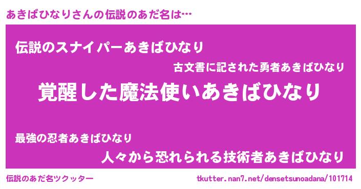 | 男性向けラノベタイトル風あだ名 | 『あきばひなりの嫁は女の子じゃないと思った?』 |