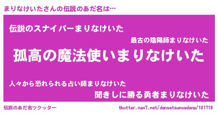 | 女子向けラノベタイトル風あだ名 | 『まりなけいたが死なない童話 林檎のまりなけいたの診療簿』 |