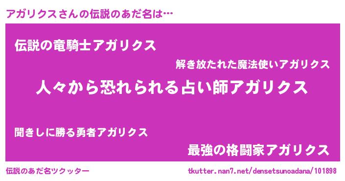 | 女子向けラノベタイトル風あだ名 | 『アガリクス夫妻のなれそめ』 |