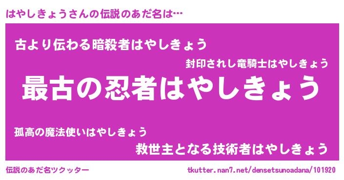 | 男性向けラノベタイトル風あだ名 | 『はやしきょうに滅ぼされるだけの簡単なお仕事です』 |