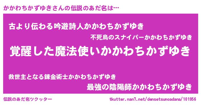 | ヒーロー風カッコイイあだ名 | 『天弓騎士カカ』『ネオカカワチカズユキ』 |