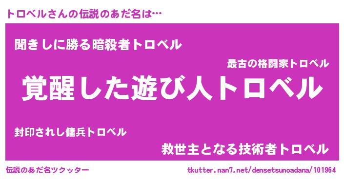 | 男性向けラノベタイトル風あだ名 | 『トロベルの嫁は女の子じゃないと思った?』 |