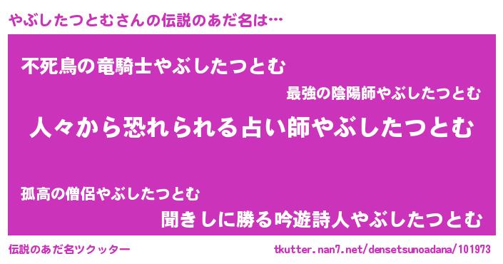 | 男性向けラノベタイトル風あだ名 | 『おまえをオタクにしてやるから、俺をやぶしたつとむにしてくれ! 』 |