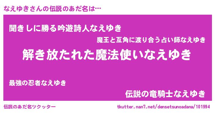 | 意味不明あだ名 | 『自称なえゆき』『永久保存なえゆき』 |