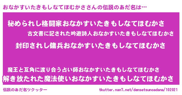 | 男性向けラノベタイトル風あだ名 | 『おなかすいたきもしなてほむかさに滅ぼされるだけの簡単なお仕事です』 |