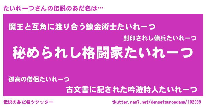 | 男性向けラノベタイトル風あだ名 | 『タイレーツスレイヤー』 |