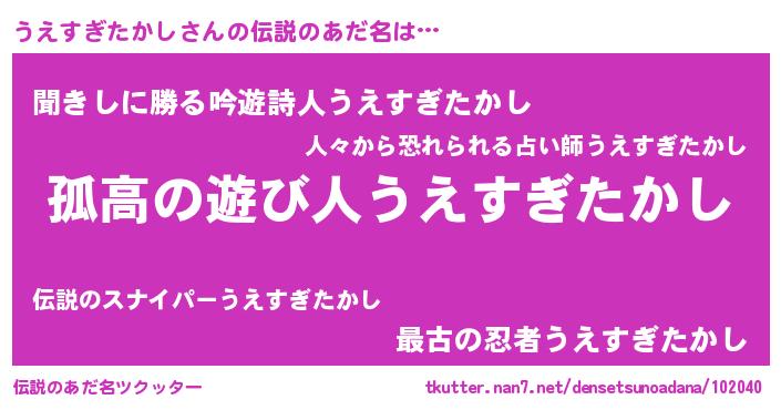 | 意味不明あだ名 | 『住所不定無職うえすぎたかし(77歳)』 |